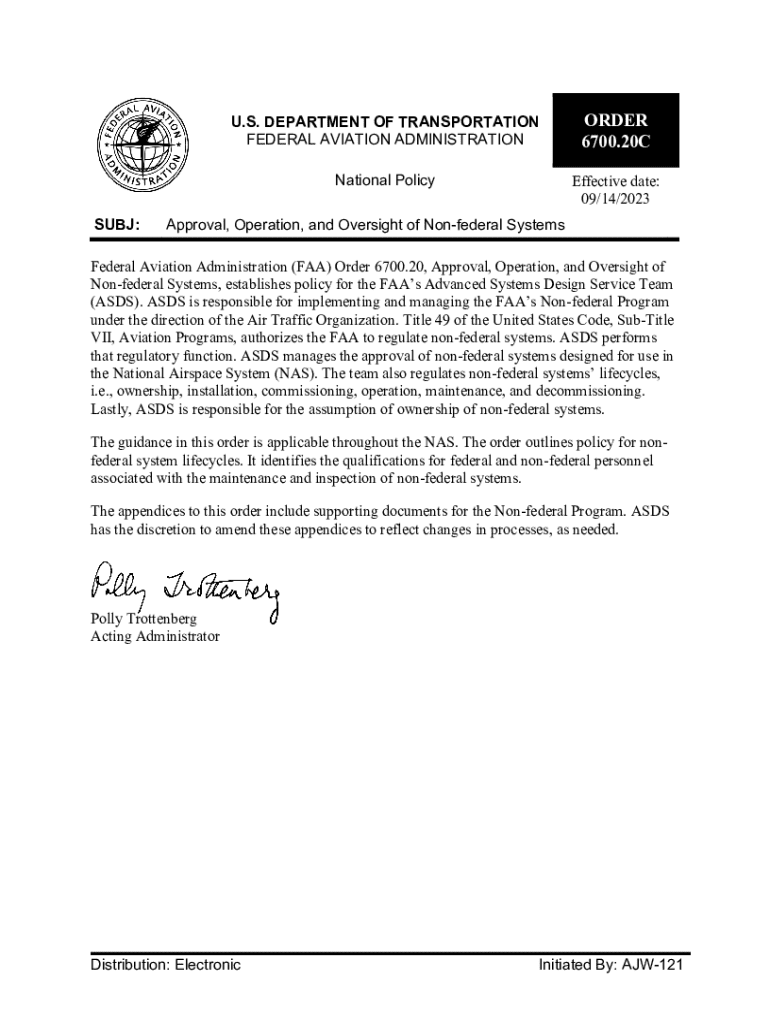 This order establishes policies for the FAA’s Advanced Systems Design Service Team (ASDS) regarding the management, operation, and oversight of non-federal systems within the National Airspace System