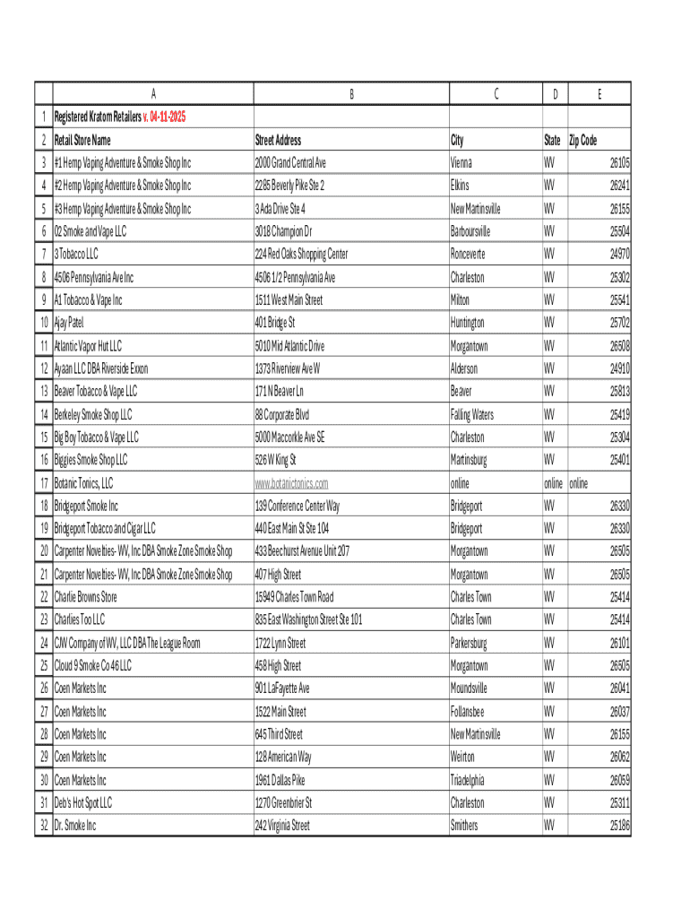 This document lists various registered kratom retailers along with their names, addresses, cities, states, and zip codes in West Virginia.