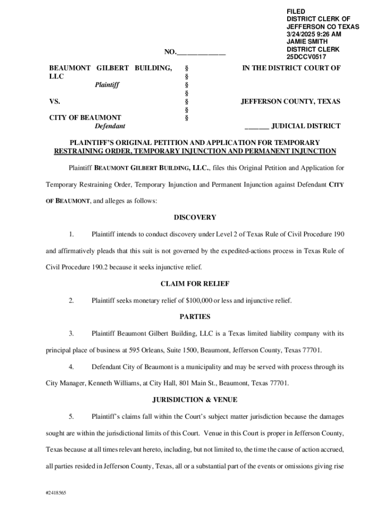 NO.___ BEAUMONT GILBERT BUILDING, LLC Plaintiff VS. CITY OF BEAUMONT Defendant FILED DISTRICT CLERK OF JEFFERSON CO TEXAS 3/24/2025 9:26 AM JAMIE SMITH DISTRICT CLERK 25DCCV0517IN THE DISTRICT COURT