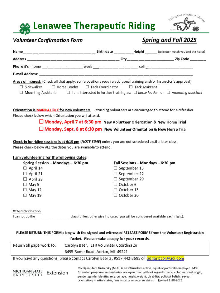 Submit the completed form via email or in person to the Lenawee Therapeutic Riding organization.