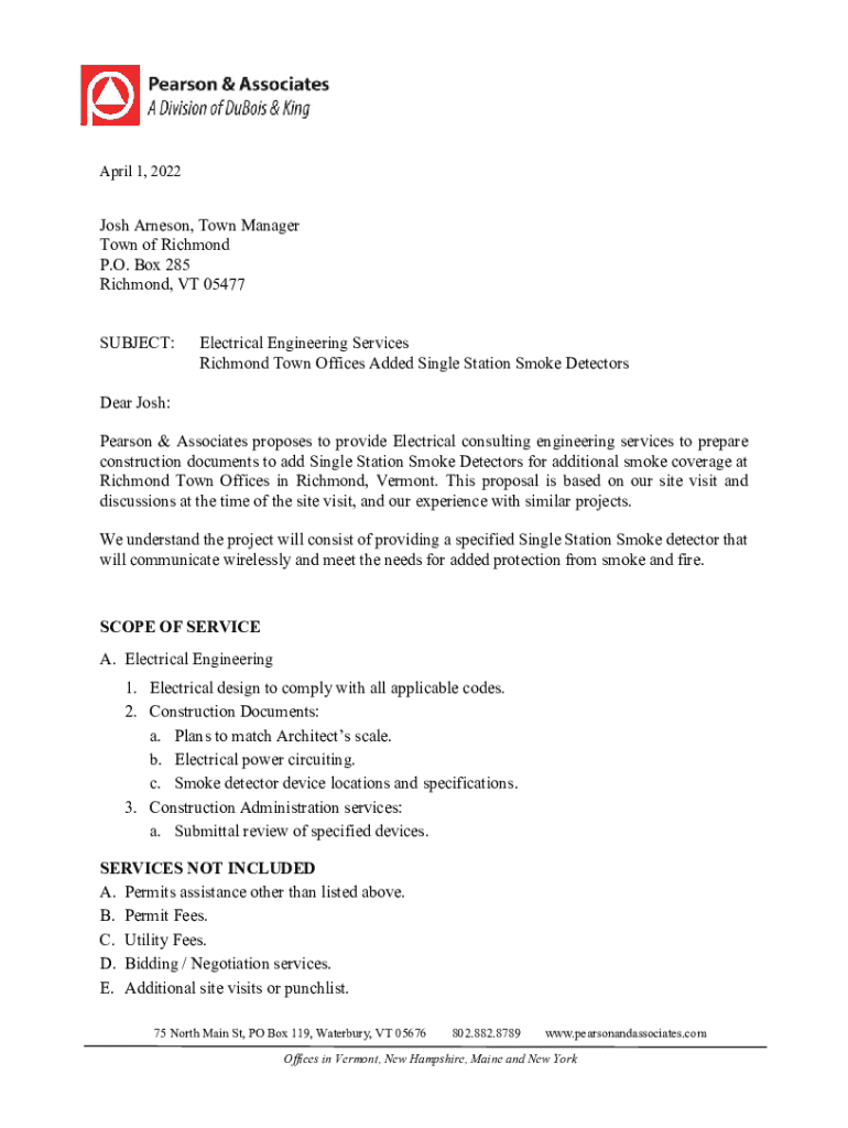 April 1, 2022Josh Arneson, Town Manager Town of Richmond P.O. Box 285 Richmond, VT 05477SUBJECT:Electrical Engineering Services Richmond Town Offices Added Single Station Smoke DetectorsDear Josh: