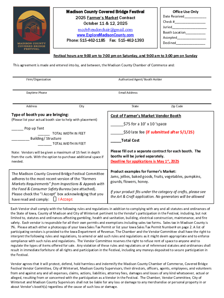 Este formulario es un contrato para la participación en el Mercado de Agricultores del Madison County Covered Bridge Festival, donde los vendedores pueden presentar sus productos. Incluye detalles