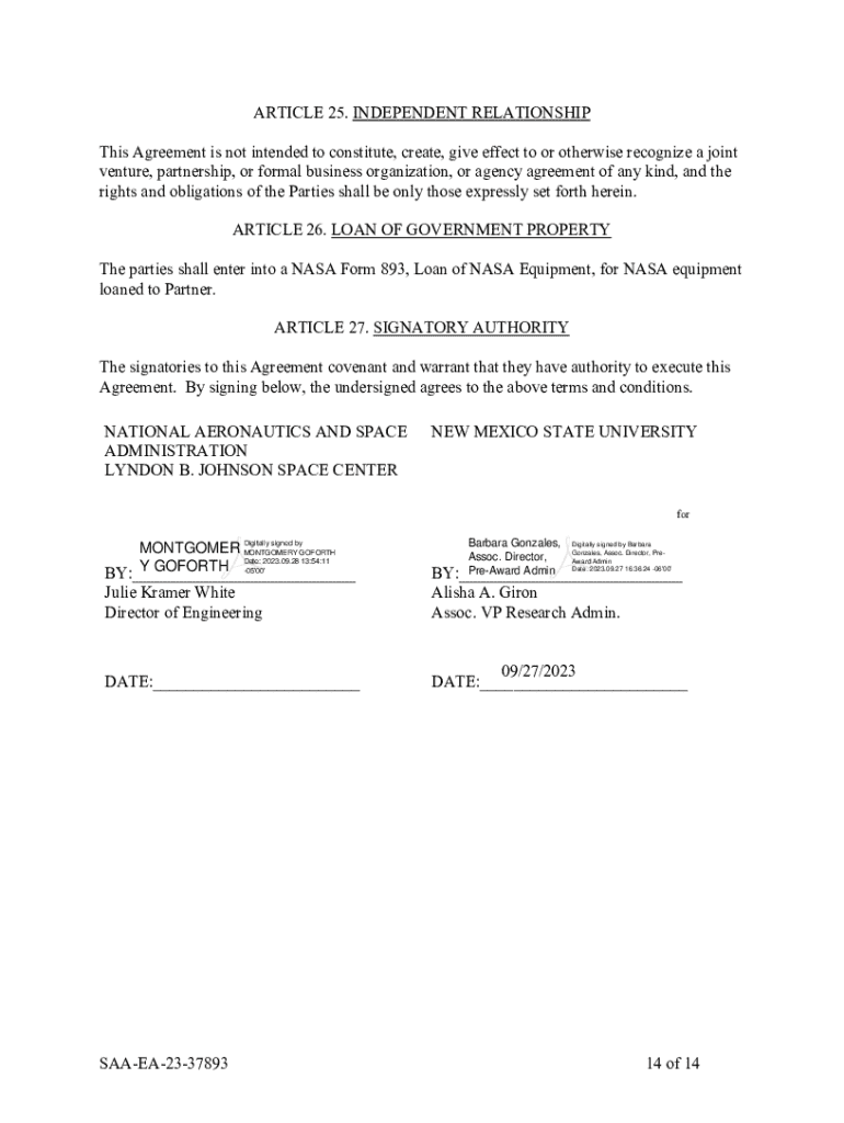 To fill out a nonreimbursable Space Act Agreement, interested parties must complete the required forms which detail the scope of work, objectives, and contributions of each party. Additionally, they must provide information regarding the benefits to NASA, the nature of the collaboration, and any intellectual property considerations.