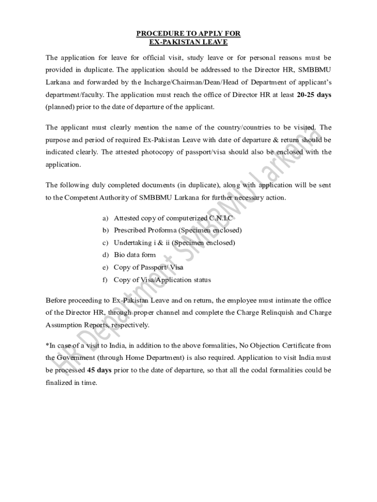 This document outlines the procedure for applying for Ex-Pakistan leave for official visits, study leave, or personal reasons. It details the necessary documents, timelines, and specific requirements