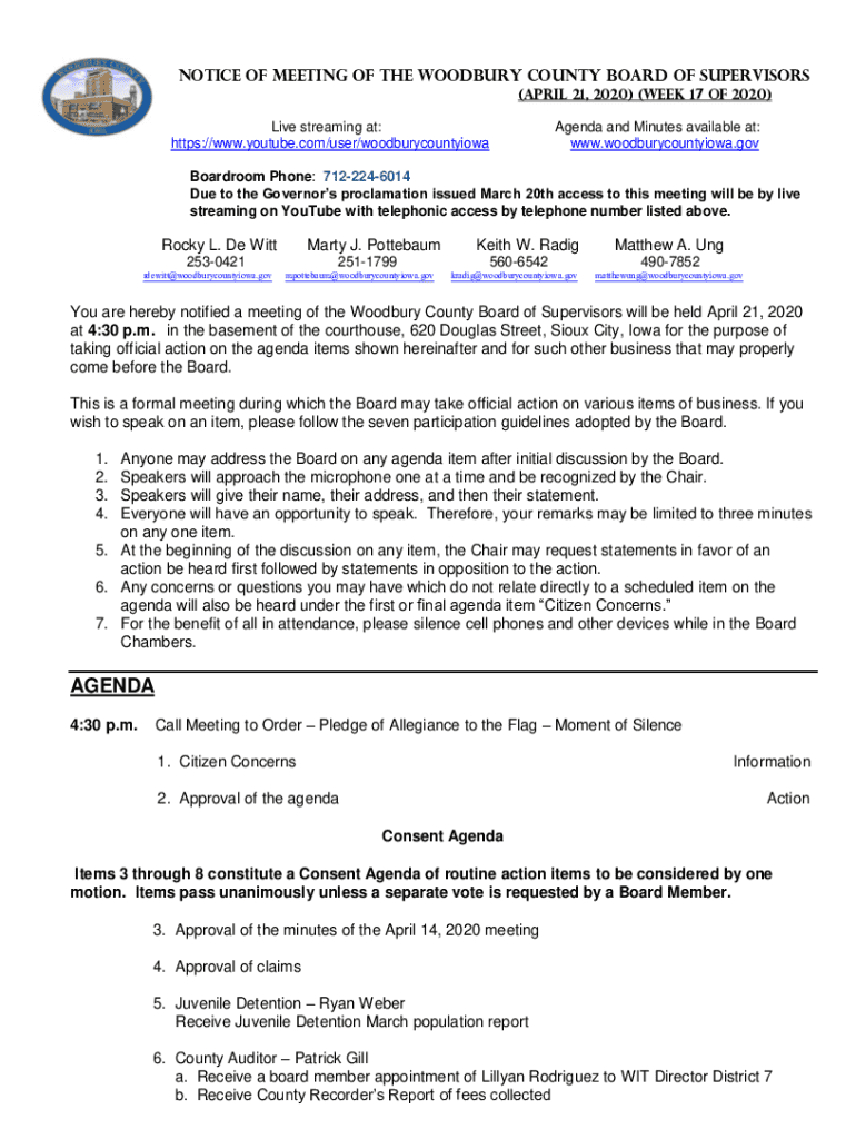 This document serves as a formal notice for the meeting of the Woodbury County Board of Supervisors scheduled for April 21, 2020. It includes details on the agenda, accessibility via live streaming,