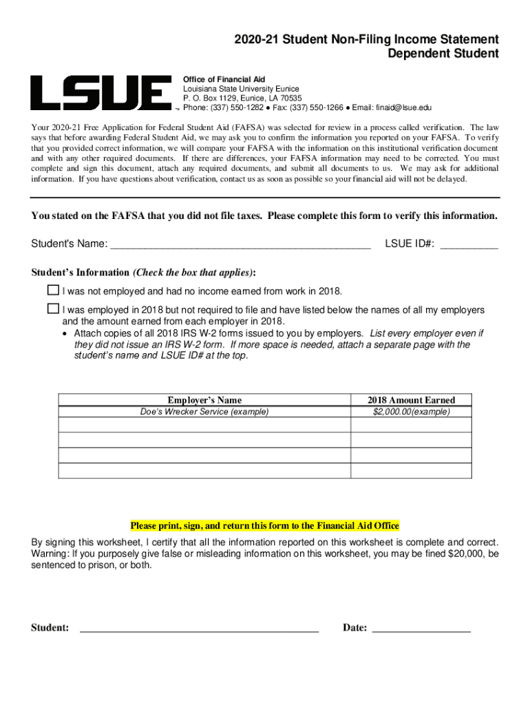 This document is used by dependent students at Louisiana State University Eunice to verify their income status when they have not filed taxes for the 2018 year. It is part of the verification process