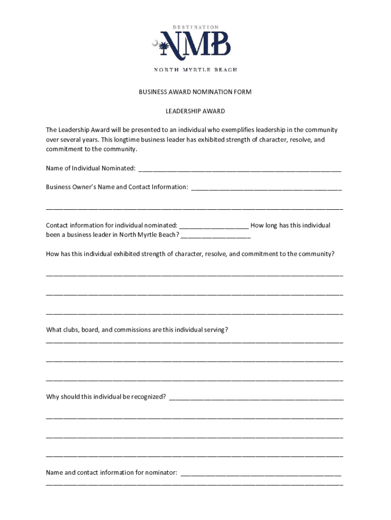 A business award nomination form is a document used to nominate a business or individual for a specific award, recognizing their achievements or contributions in a particular field.