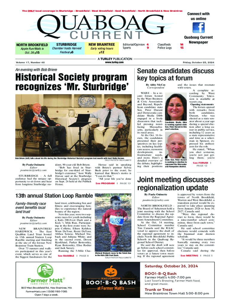 The ONLY local coverage in Sturbridge Brookfield West Brookfield East Brookfield North Brookfield & New BraintreeConnect with us onlineCURRENT NORTH BROOKFIELD Apple Run/Walk is Oct. 26 p15STURBRIDGENEW