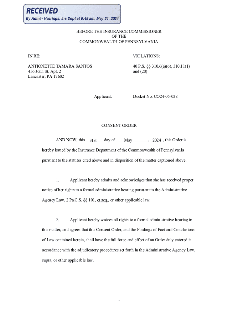 By Admin Hearings, Ins Dept at 9:48 am, May 31, 2024BEFORE THE INSURANCE COMMISSIONER OF THE COMMONWEALTH OF PENNSYLVANIA IN RE: ANTIONETTE TAMARA SANTOS 416 John St. Apt. 2 Lancaster, PA 17602Applicant.:
