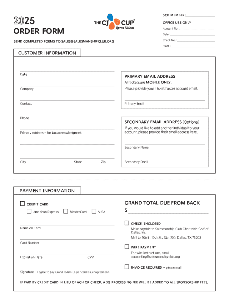 This document serves as an order form for tickets and sponsorships associated with the Salesmanship Club, including various hospitality options, ticket packages, and payment information.
