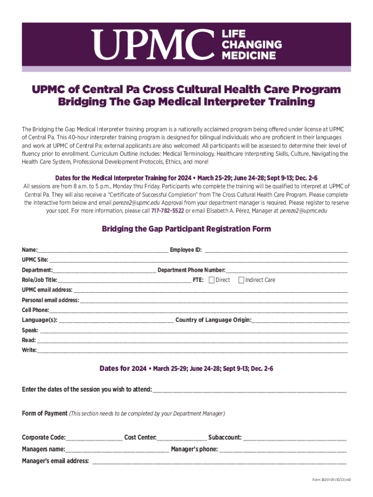 The Bridging the Gap Medical Interpreter training program is a 40-hour program designed for bilingual individuals who wish to become certified medical interpreters. The curriculum includes medical