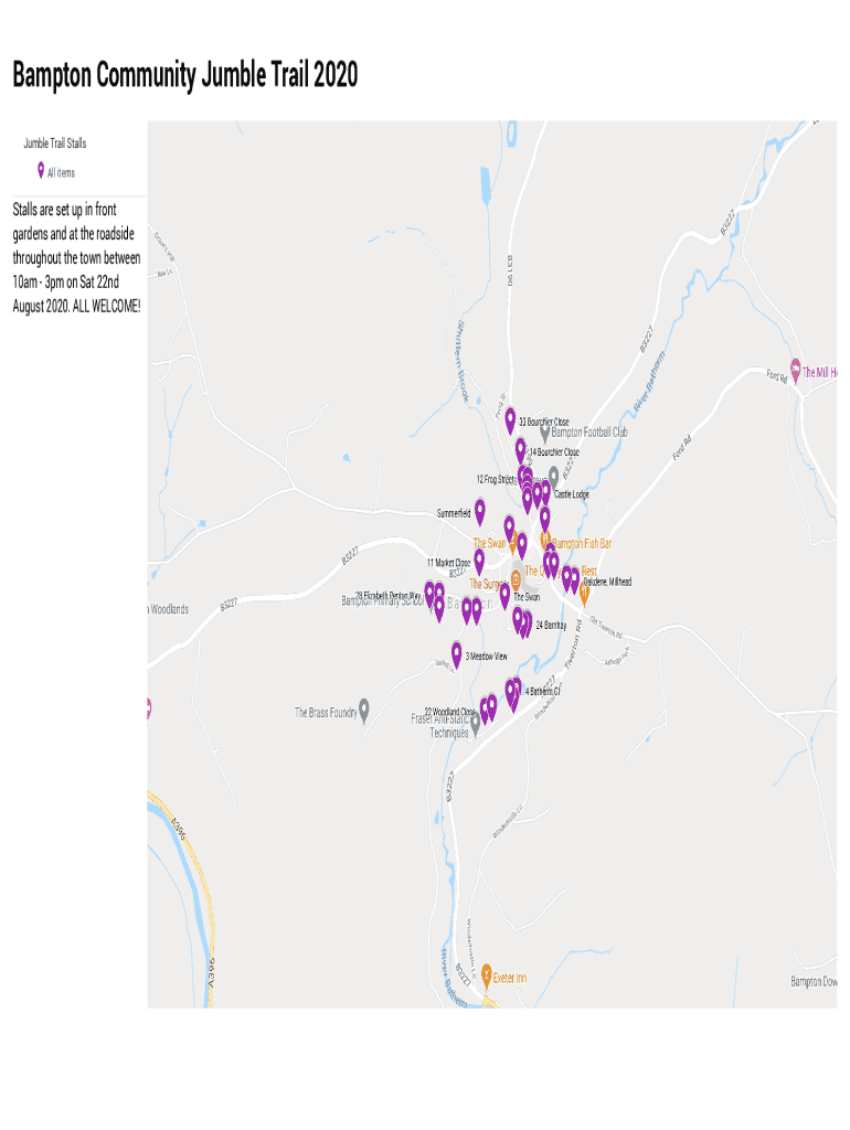 Information about the community jumble trail event in Bampton, including stall locations and details of the event.