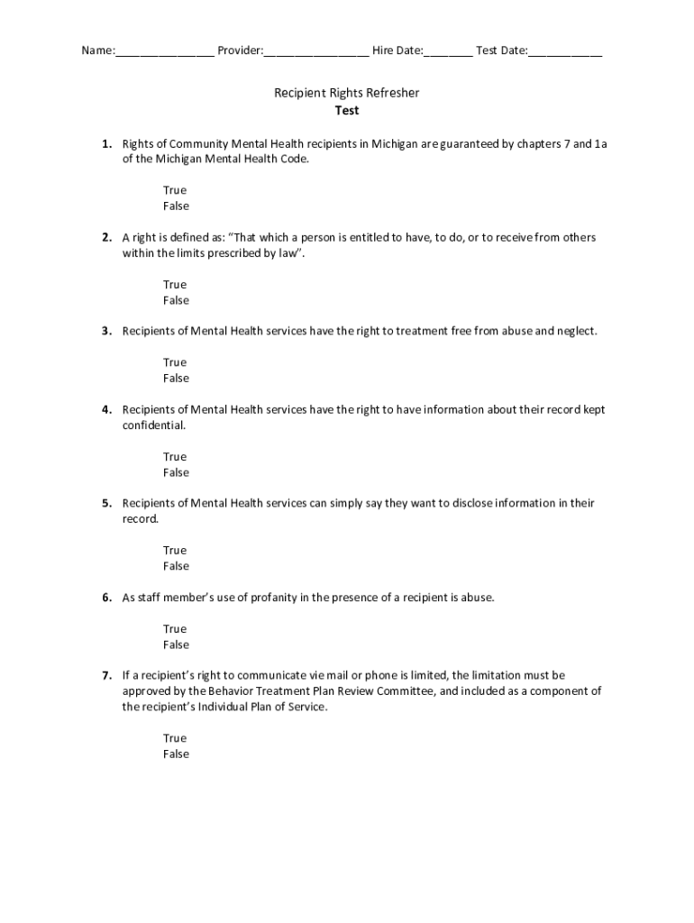 Name:___ Provider:___ Hire Date:___ Test Date:___Recipient Rights Refresher Test 1. Rights of Community Mental Health recipients in Michigan are guaranteed by chapters 7 and 1a of the Michigan Mental