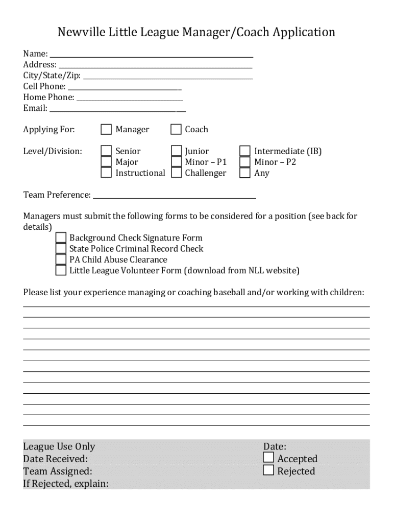 This document is an application form for individuals interested in becoming a manager or coach for the Newville Little League, detailing the application process, required background checks, and experience