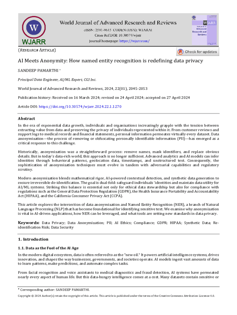 AI Meets Anonymity: How named entity recognition is redefining data privacy SANDEEP PAMARTHI * Principal Data Engineer, AI/ML Expert, CGI Inc. World Journal of Advanced Research and Reviews, 2024,