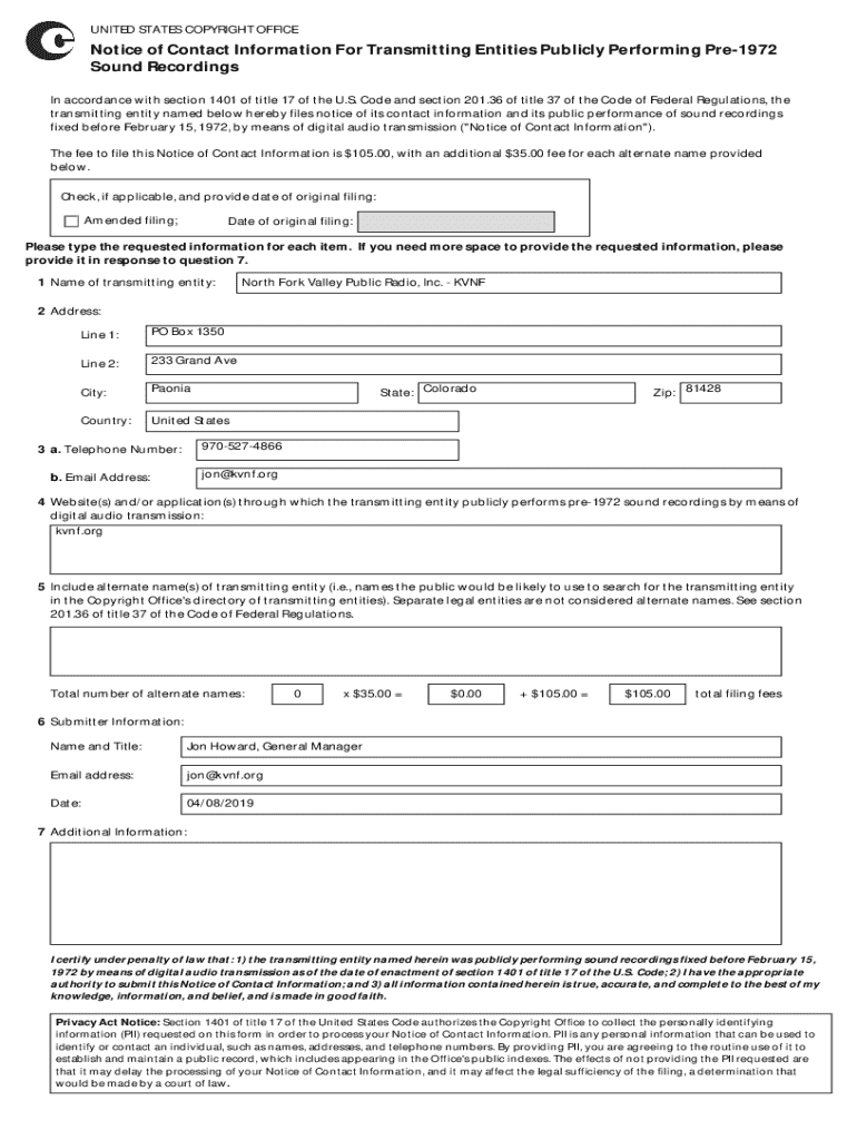 Get the free Notice of Contact Information for Transmitting Entities Publicly Performing Pre-1972...
