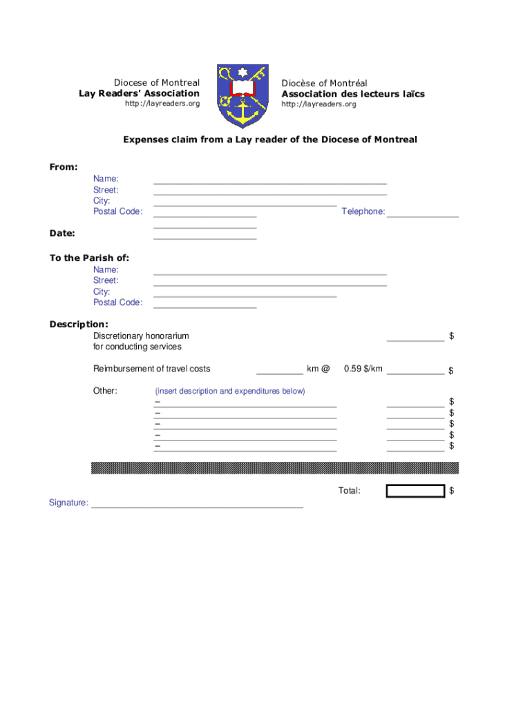 This form is used by lay readers of the Diocese of Montreal to claim expenses, including discretionary honorarium and reimbursement for travel costs related to conducting services.