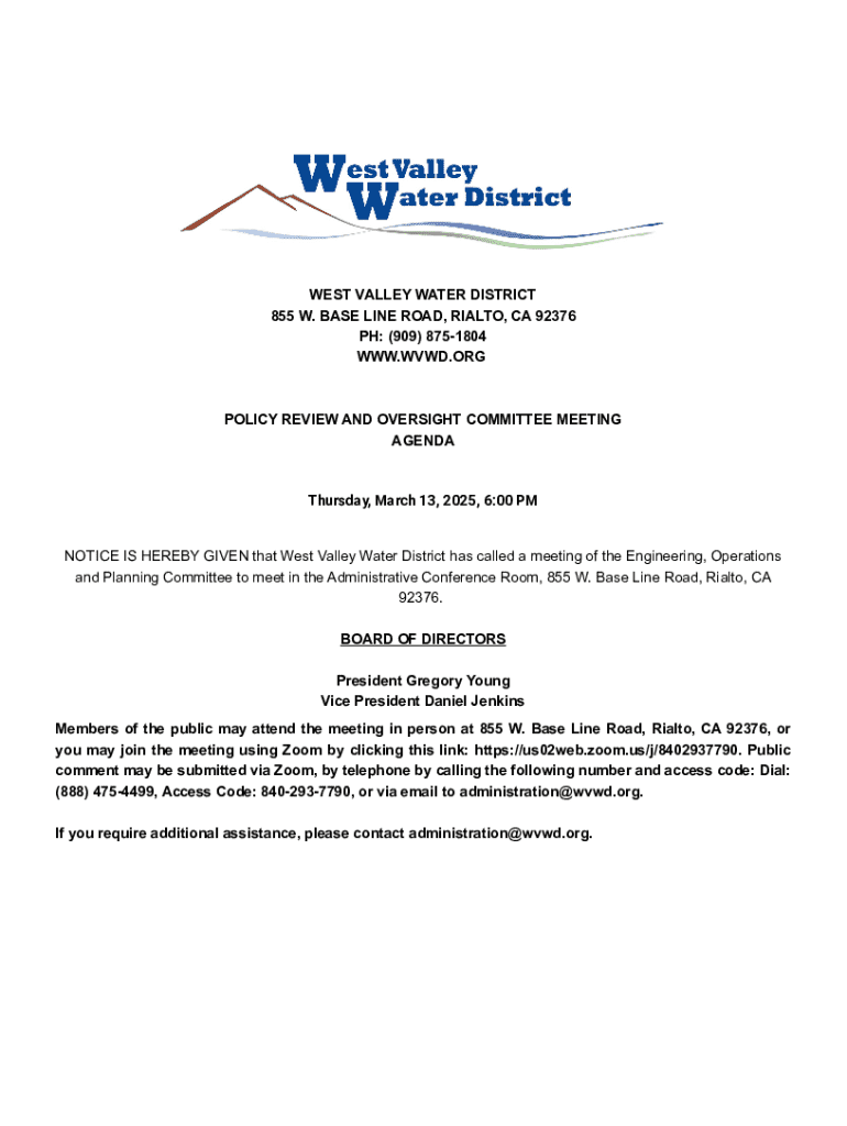 WEST VALLEY WATER DISTRICT 855 W. BASE LINE ROAD, RIALTO, CA 92376 PH: (909) 8751804 WWW.WVWD.ORGPOLICY REVIEW AND OVERSIGHT COMMITTEE MEETING AGENDAThursday, March 13, 2025, 6:00 PMNOTICE IS HEREBY