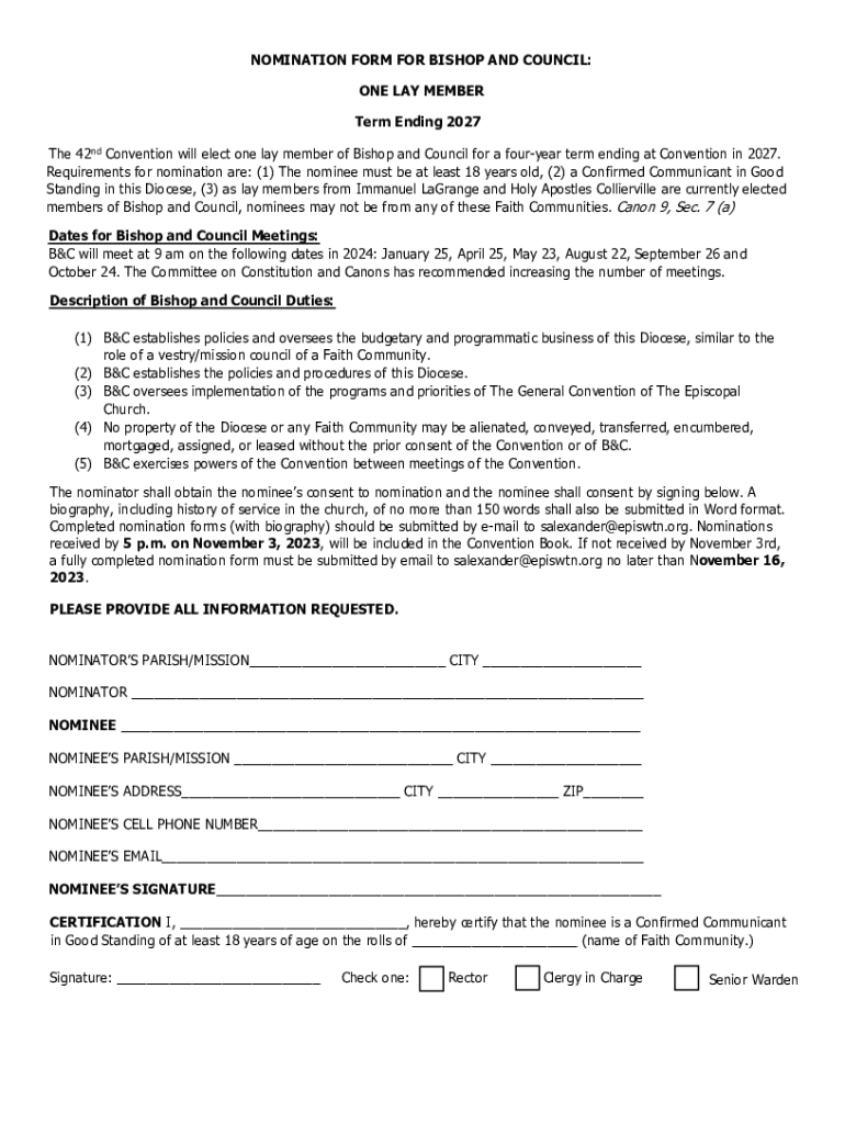 Get the free Nomination Form for Bishop and Council