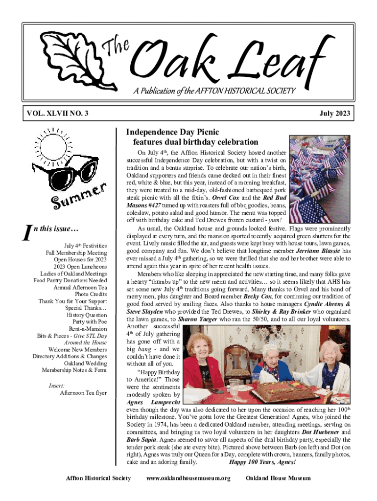 Th eOak LeafVOL. XLVII NO. 3July 2023Independence Day Picnic features dual birthday celebrationSuIer m mn this issue July 4th Festivities Fall Membership Meeting Open Houses for 2023 2023 Open Luncheons