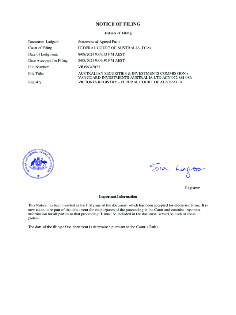 This document outlines important information regarding false or misleading representations made by Vanguard Investments in relation to the Vanguard Ethically Conscious Global Aggregate Bond Index