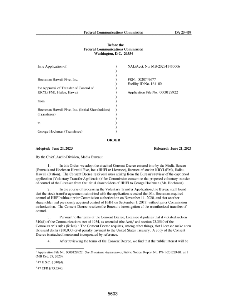 Federal Communications CommissionDA 23459Before the Federal Communications Commission Washington, D.C. 20554In re Application ofHochman Hawaii Five, Inc. for Approval of Transfer of Control of KRYL(FM),