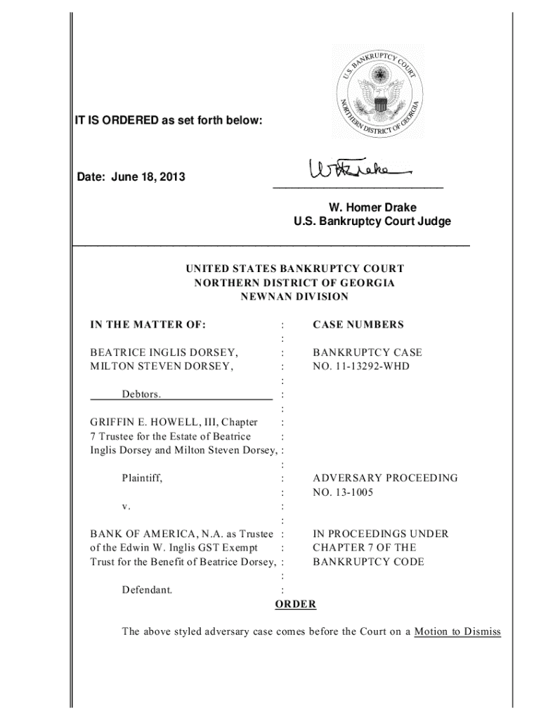 IT IS ORDERED as set forth below:Date: June 18, 2013___ W. Homer Drake U.S. Bankruptcy Court Judge___ UNITED STATES BANKRUPTCY COURT NORTHERN DISTRICT OF GEORGIA NEWNAN DIVISION : CASE NUMBERS : BEATRICE