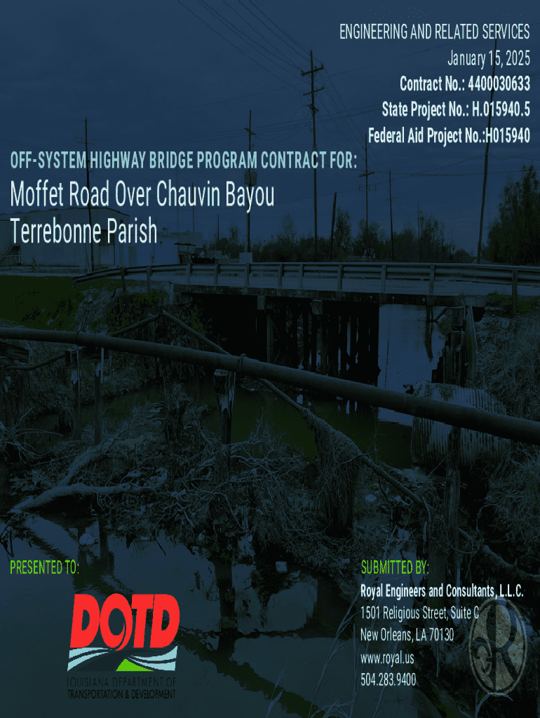 This document outlines the proposal for the Off-System Highway Bridge Program concerning the Moffet Road Over Chauvin Bayou project in Terrebonne Parish, emphasizing engineering services, project