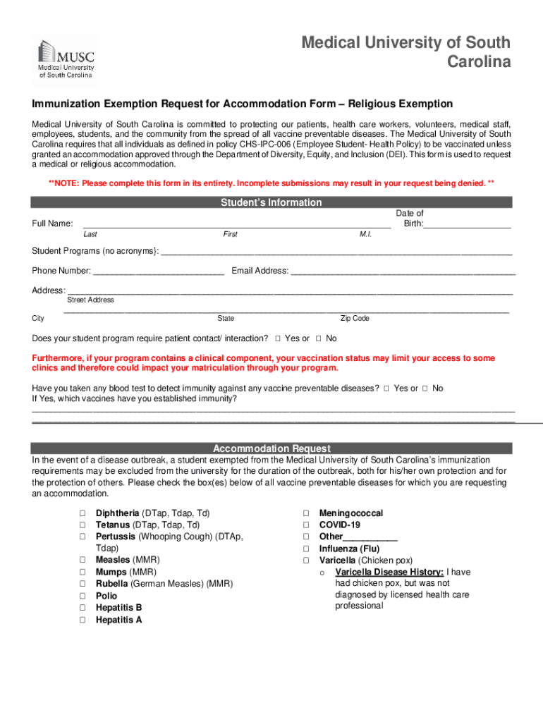 This form is used to request a medical or religious accommodation from the immunization requirements of the Medical University of South Carolina.