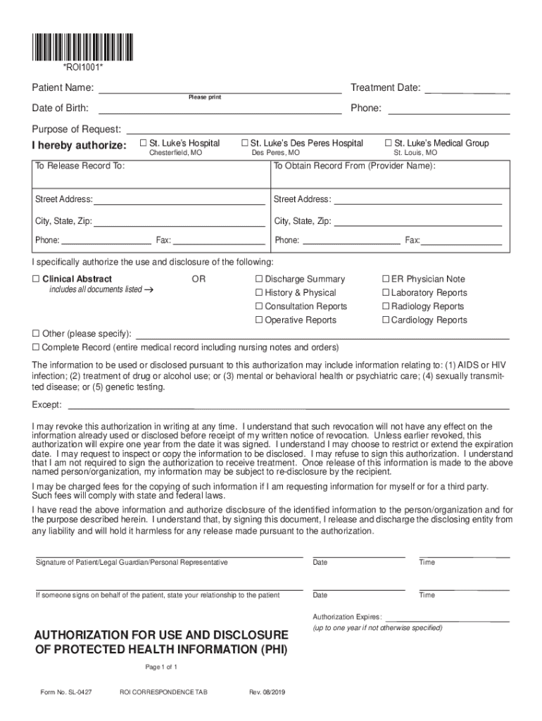 This form is used to authorize the release of medical records from St. Luke\'s Hospital and its affiliates. It allows patients to specify what information to disclose, including clinical abstracts