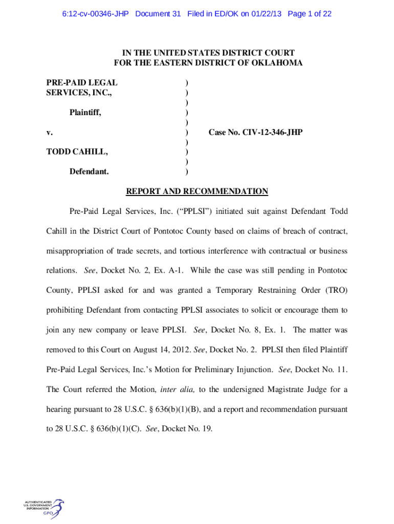 6:12cv00346JHP Document 31 Filed in ED/OK on 01/22/13 Page 1 of 22IN THE UNITED STATES DISTRICT COURT FOR THE EASTERN DISTRICT OF OKLAHOMA PREPAID LEGAL SERVICES, INC., Plaintiff, v. TODD CAHILL,