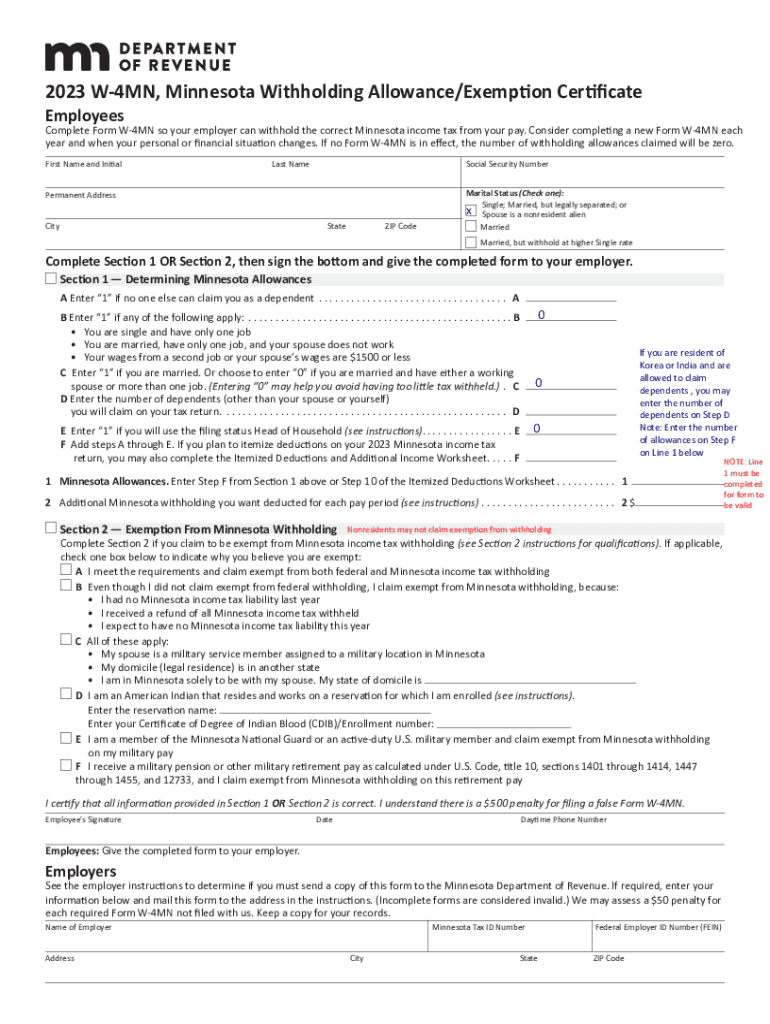 Complete Form W-4MN so your employer can withhold the correct Minnesota income tax from your pay. Consider completing a new Form W-4MN each year and when your personal or financial situation changes.