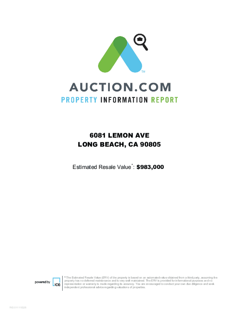 6081 LEMON AVE LONG BEACH, CA 90805 Estimated Resale Value *: $983,000* The Estimated Resale Value (ERV) of the property is based on an automated value obtained from a third party, assuming the property