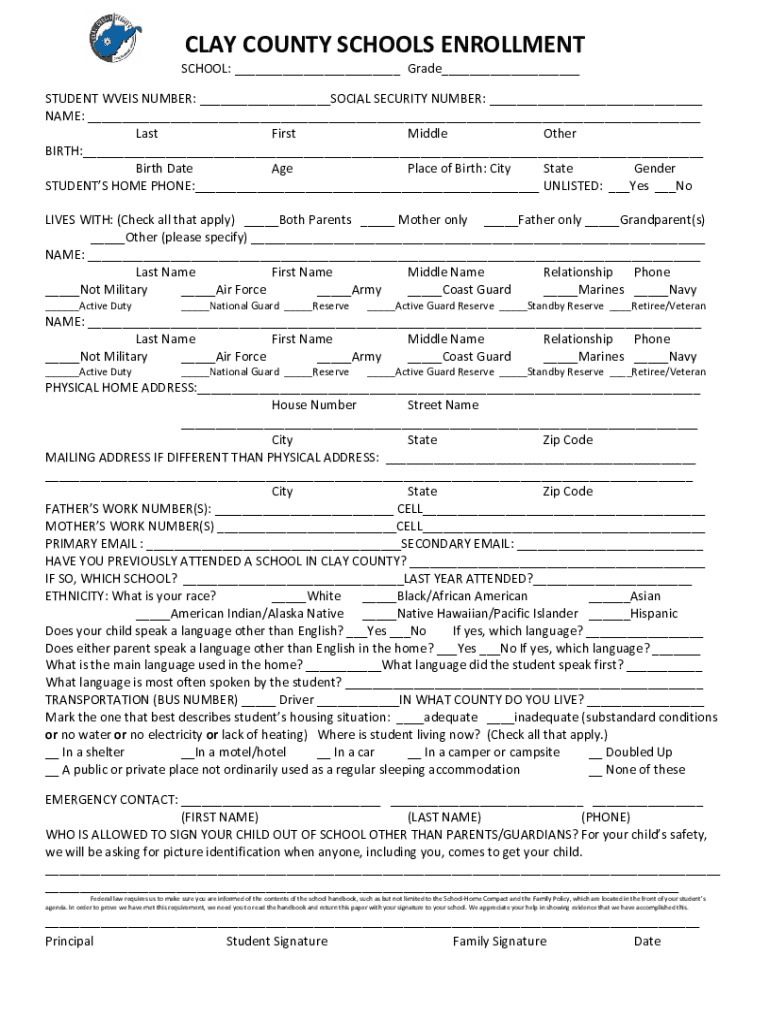 Enrollment form for students in Clay County Schools, collecting personal, contact, and health information, as well as insights into the student\'s living situations and educational needs.