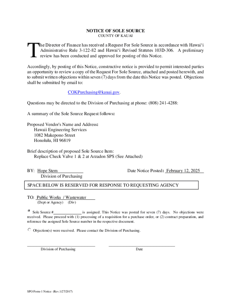 This document serves as a notice for the posting of a Request For Sole Source regarding the replacement of check valves at a wastewater facility in Kauai. It includes vendor information, estimated