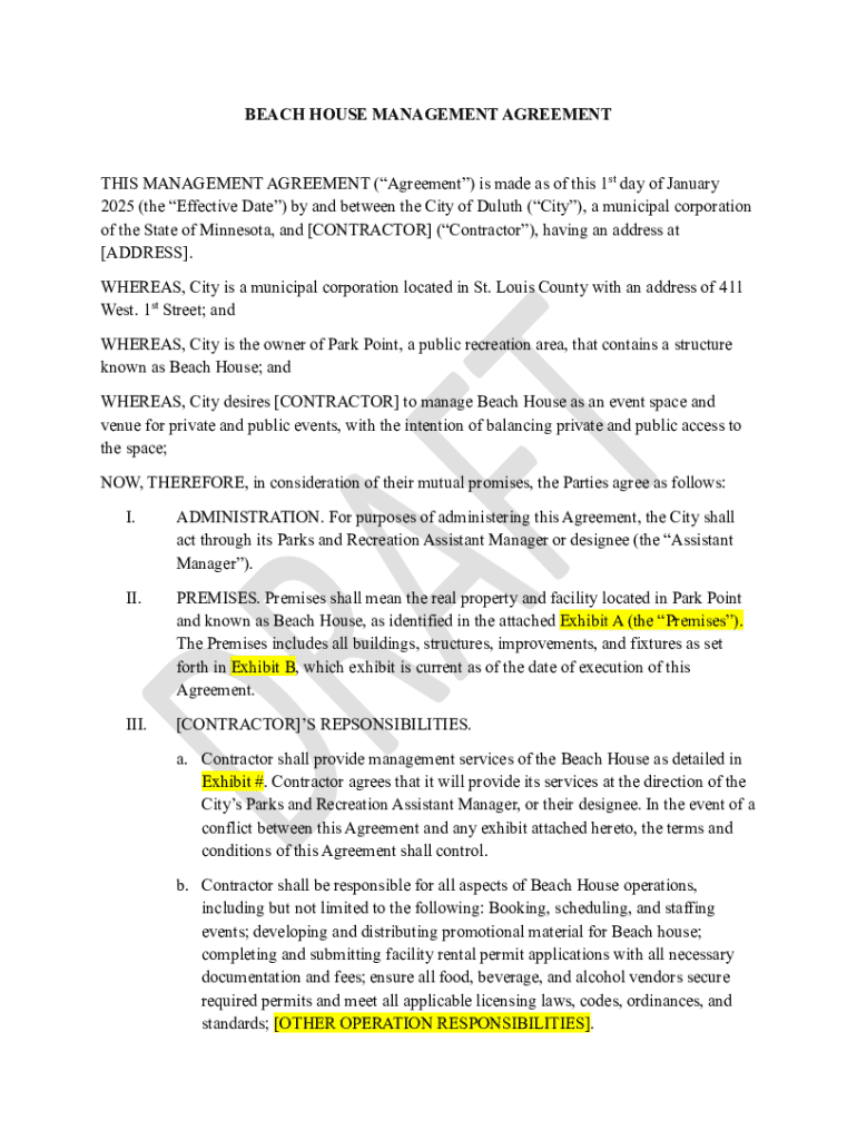 Este acuerdo de gestión establece los términos y condiciones bajo los cuales un contratista administrará la casa de playa en Park Point, Duluth, para eventos públicos y privados, definiendo responsabilidades,