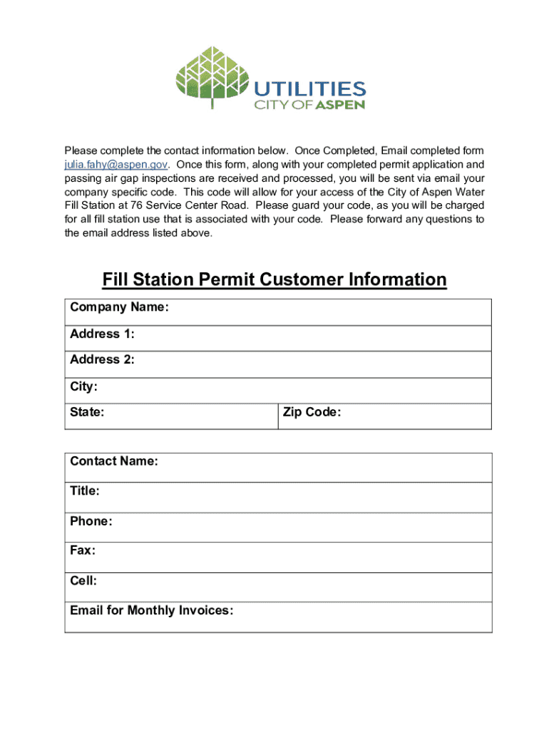 Enclosed is the Bulk Water Fill Station Permit application guide. It provides instructions for the application process and requirements for obtaining a permit to access the City of Aspen Bulk Water