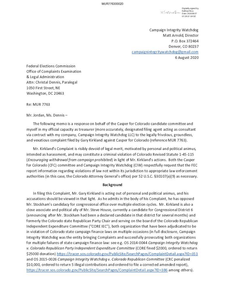 MUR776300020 Digitally signed by Kathryn Ross Date: 2020.08.07 07:29:37 04\'00\'Campaign Integrity Watchdog Matt Arnold, Director P.O. Box 372464 Denver, CO 80237 campaignintegritywatchdog@gmail.com