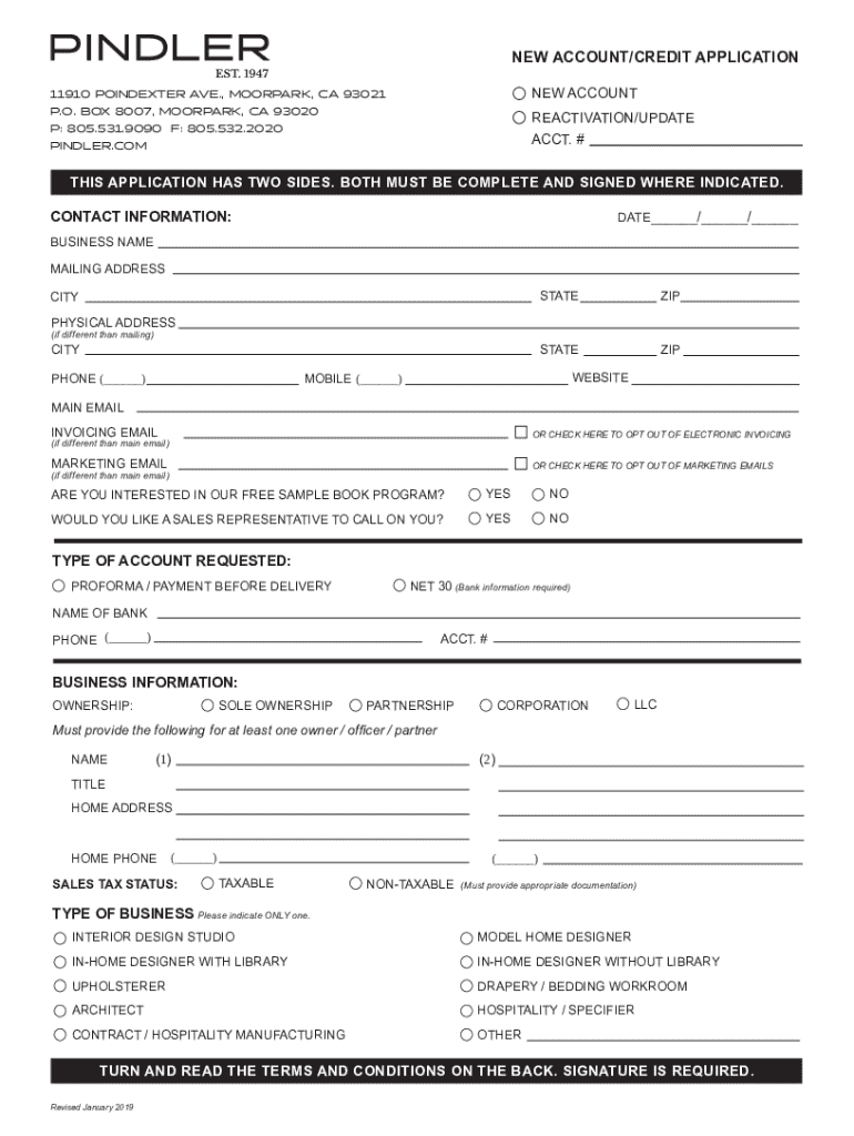 This document serves as an application for establishing a new account or reactivating an existing account with Pindler & Pindler, Inc. It includes sections for filling out contact and business information,