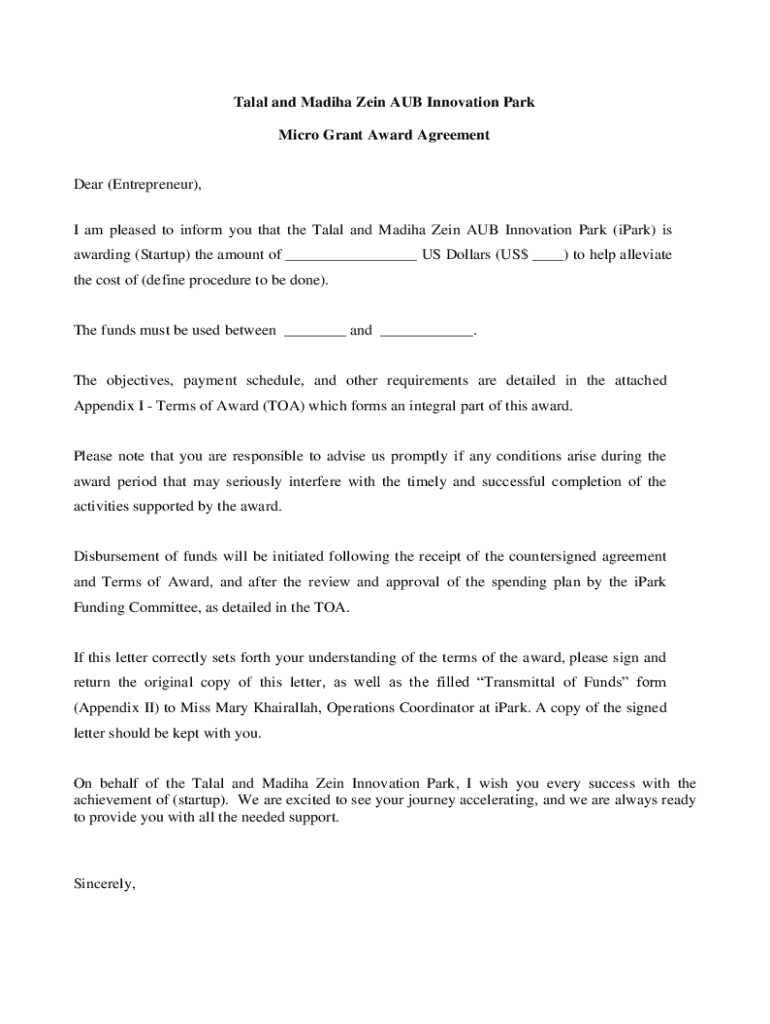 Get the free Talal and Madiha Zein Aub Innovation Park Micro Grant Award Agreement