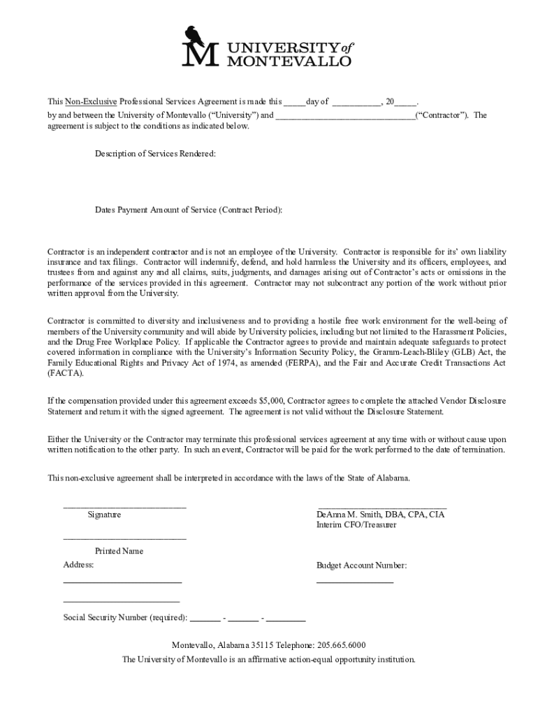 Este acuerdo establece los términos y condiciones bajo los cuales el Contratista proporcionará servicios profesionales a la Universidad de Montevallo. El Contratista es un contratista independiente