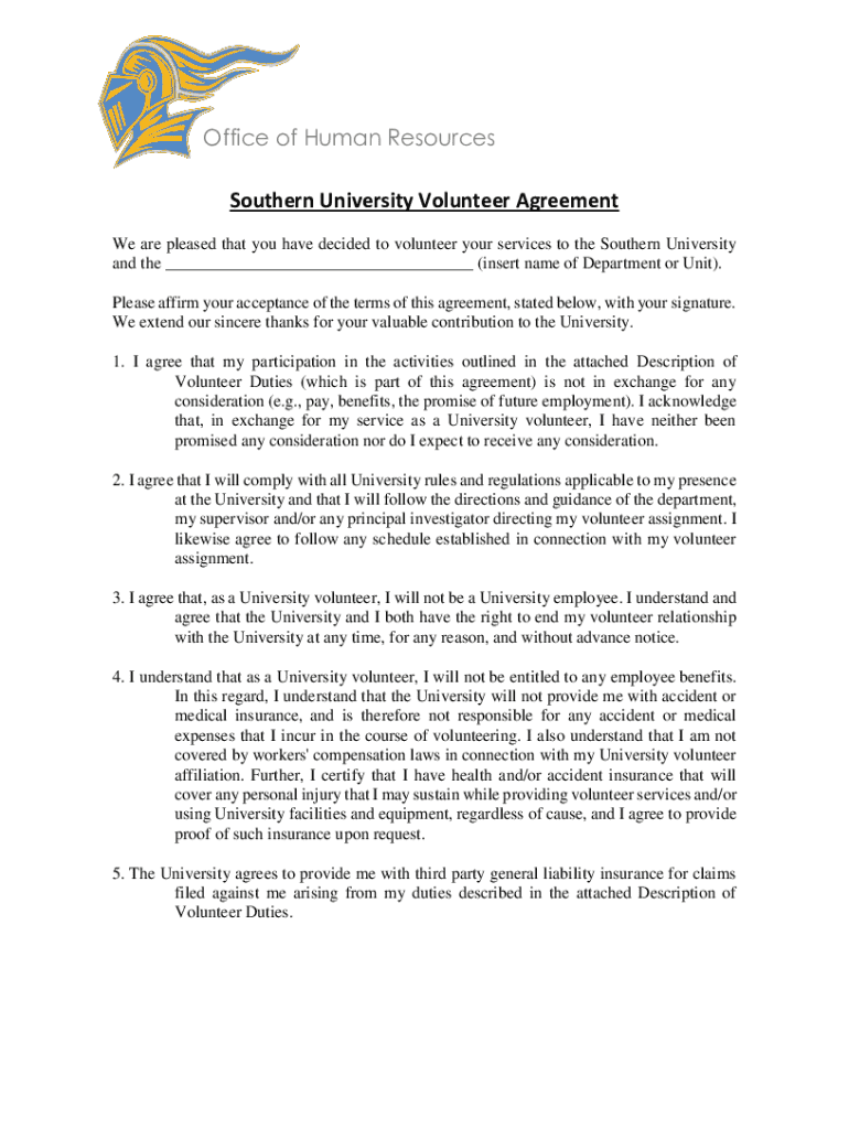 The souformrn university volunteer agreement is a formal document that outlines the terms and conditions under which volunteers engage with the university, specifying their roles, responsibilities, and the nature of their service.