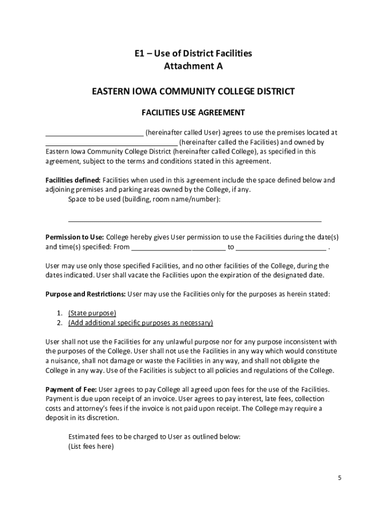 Este acuerdo establece los términos y condiciones bajo los cuales un usuario puede utilizar las instalaciones de Eastern Iowa Community College District, incluyendo permisos, restricciones, tarifas