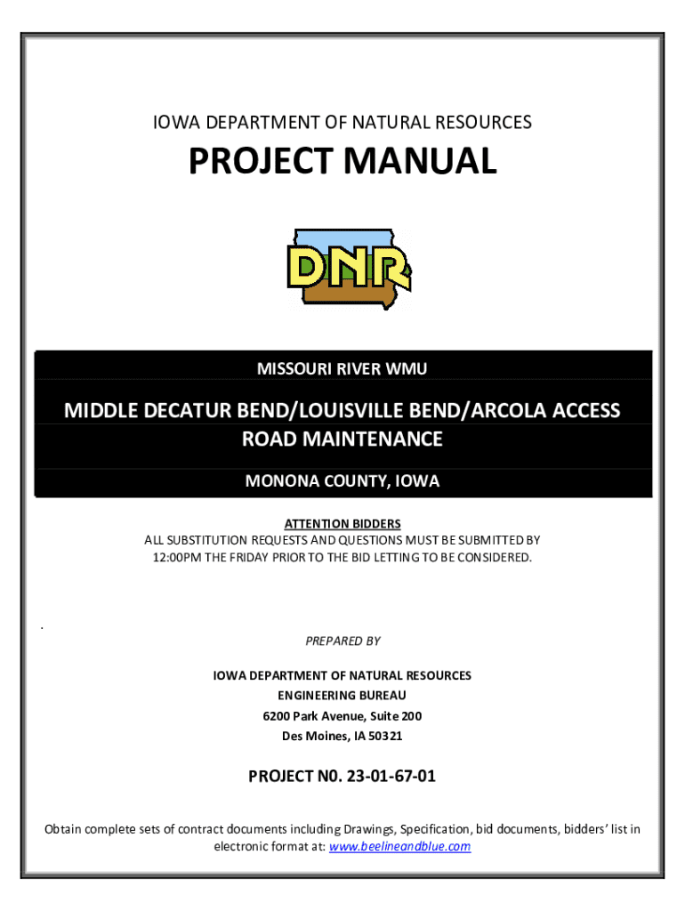 This project manual outlines the requirements and provisions for the maintenance of the middle Decatur Bend/Louisville Bend/Arcola access road in Monona County, Iowa. It includes bidding requirements,