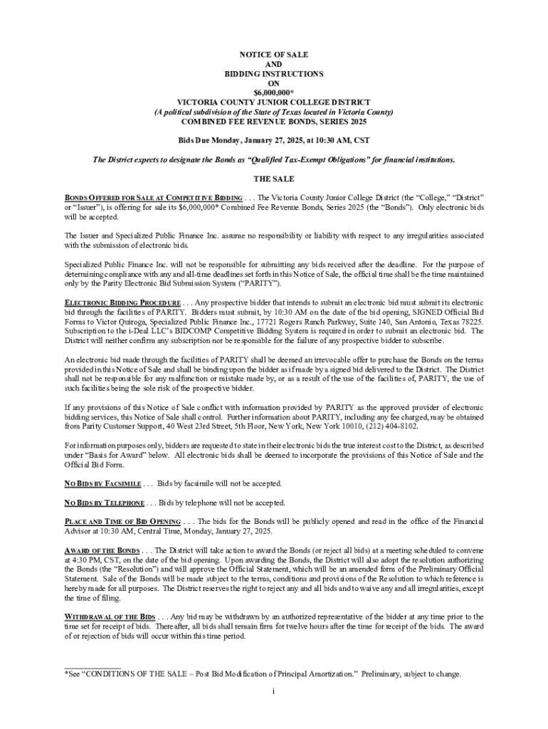 This document provides a notice of sale and bidding instructions for the Victoria County Junior College District\'s issuance of Combined Fee Revenue Bonds, Series 2025. It includes details regarding
