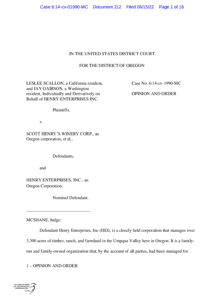 This document outlines the Opinion and Order issued by Judge Michael McShane concerning a shareholder derivative action involving Leslee Scallon and Jay Gairson against Scott Henry’s Winery Corp.