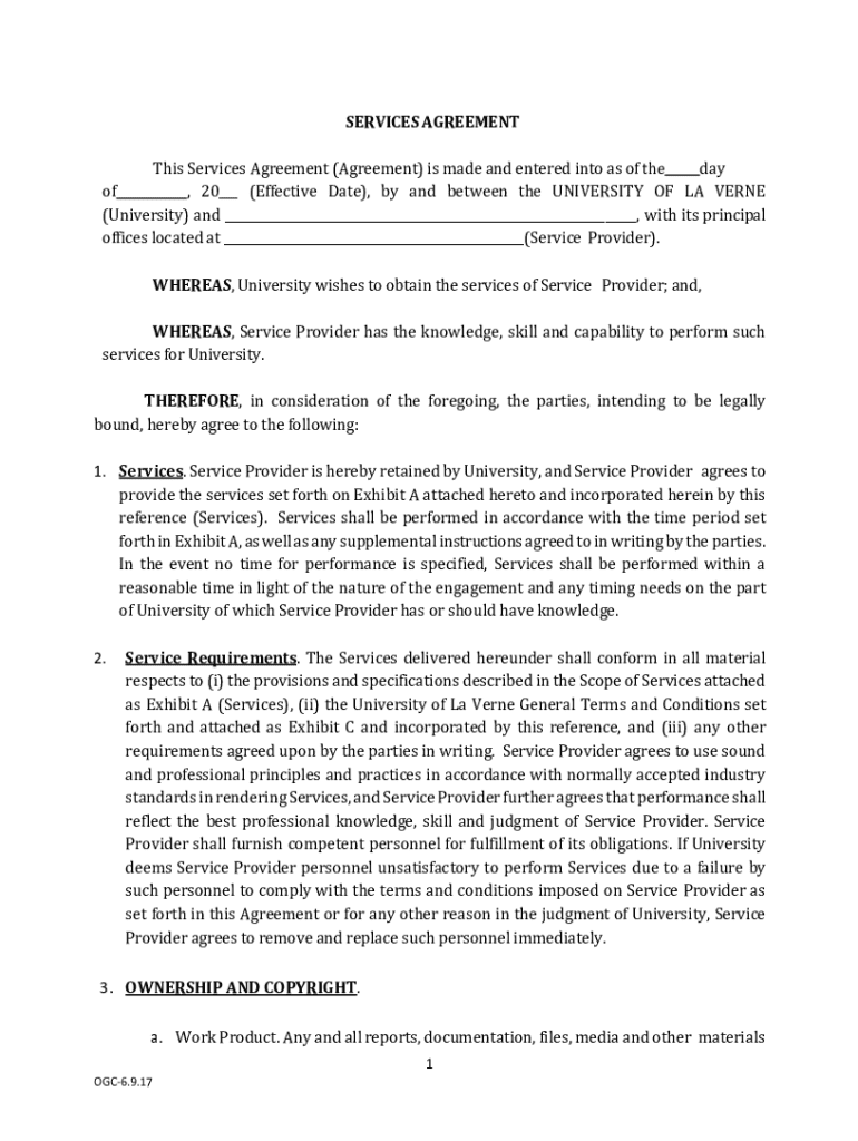 This document outlines the terms and conditions under which the University of La Verne engages a Service Provider for various services, including service requirements, ownership of work product, payment