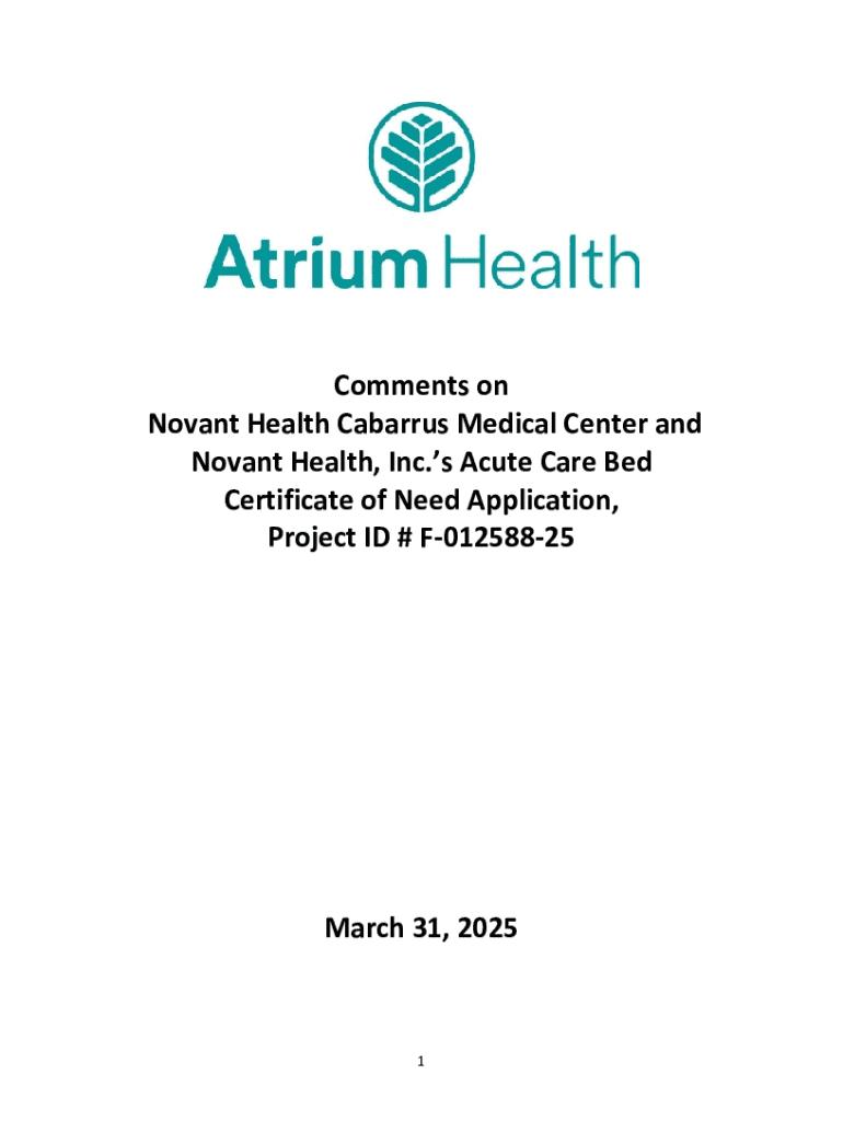 Comments on Novant Health Cabarrus Medical Center and Novant Health, Inc.s Acute Care Bed Certificate of Need Application, Project ID # F01258825March 31, 20251Competitive Comments on Cabarrus County