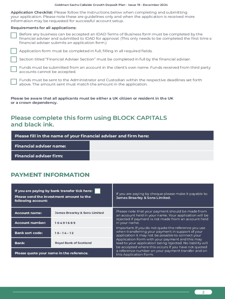 To complete the Goldman Sachs Callable Growth Deposit Plan Application Form, you must be a UK citizen or resident. Additionally, you should seek financial advice or assessment from an FCA-regulated financial adviser before applying.