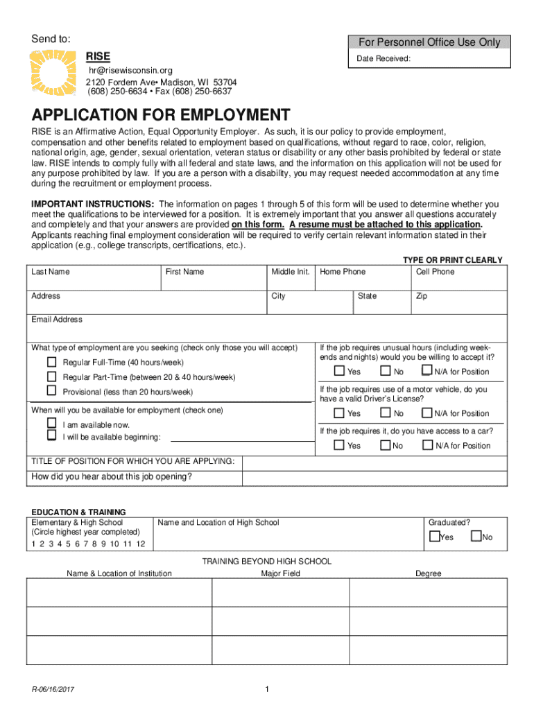 This application form is intended for individuals seeking employment at RISE. It includes sections for personal information, education, work experience, qualifications, and references. RISE is an